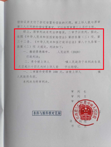 镇政府看到京平拆迁律师指出的每一点都直逼要害,实在难以应付涉案违法行为行政赔偿的关键问题,在一番唇枪舌战中逐渐败下阵来。最终,法院认可京平律师的观点,涉案房屋被违法强拆已是既定事实,李先生并未获得拆迁安置补偿权益的事实也客观存在,依法判决撤销原一审判决,并责令镇政府依法对因违法强拆行为对李先生造成的损失承担行政赔偿责任。京平律师凭借扎实的行政法律知识和高超的庭审实战技巧为当事人依法斗争,李先生主张的行政赔偿终于得到司法机关的支持!
