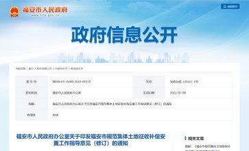 福建省《福安市规范集体土地征收补偿安置工作指导意见(修订)》自2022年7月8日起执行,有效期3年福建省《福安市规范集体土地征收补偿安置工作指导意见(修订)》福建省福安市土地征收补偿实行区片综合地价,按照《福安市人民政府关于调整征地补偿标准的通知》(安政文〔2017〕106号)标准予以适当调整(详见附件1、2)。福建省福安市农作物征收补偿实