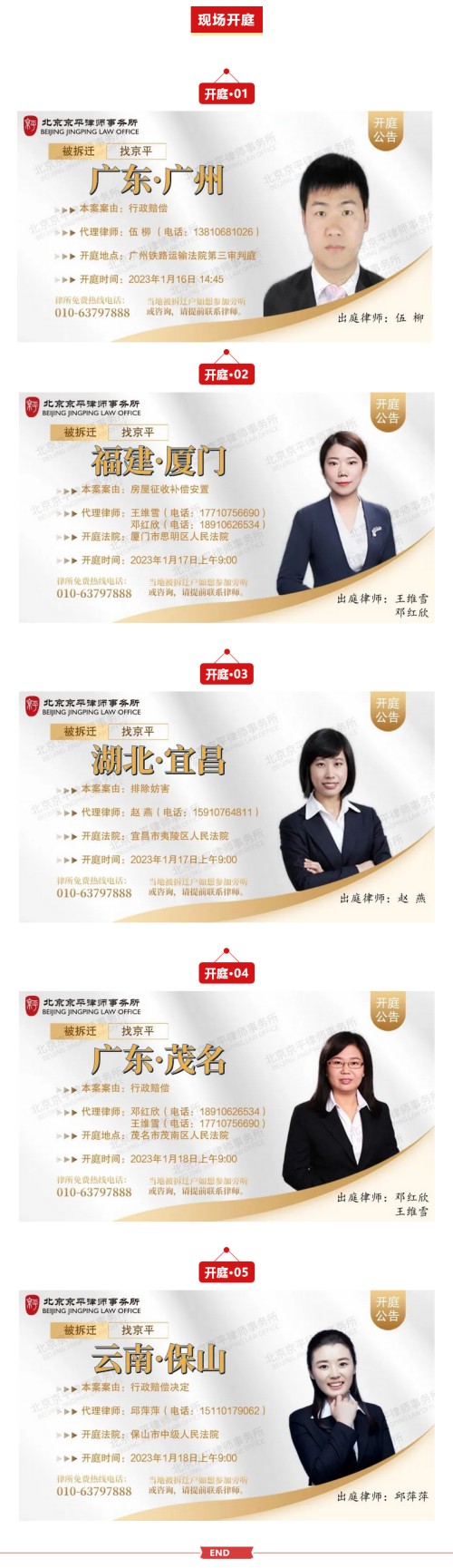 2023年01月16至2023年01月20日,北京京平律师事务所专业拆迁维权团队的律师们将前往以下城市参加拆迁维权诉讼的开庭审理。在开庭地附近,正在遭遇征地拆迁维权难题的被拆迁户可持身份证,按开庭公告的时间、地点准时到达相应法庭参加庭审旁听,学习拆迁法律维权知识,欣赏精彩民告官案件审理。在庭审后有需要咨询拆迁维权事宜的,也可提前与拆迁律师预约。望遇到拆迁难题的被拆迁户抓住难得的学习、咨询机会。欲了解更多信息,请拨打电话010-63797888转客户部或者登录访问京平拆迁律师网http://www.jinglawyer.com/。