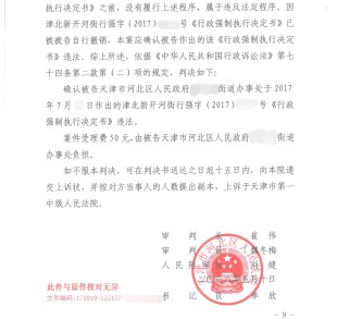 该街道办事处给自己找了种种理由,坚持认为作出前述《行政强制执行决定书》的行为合法:街道办认为自己对该具体行政行为有管辖权,符合《天津市城市管理相对集中行政处罚权》的规定;作出具体行政行为依据的事实清楚、证据充分,两位原告居住天津市河北区的房屋均未经登记,未取得过相关的行政许可。