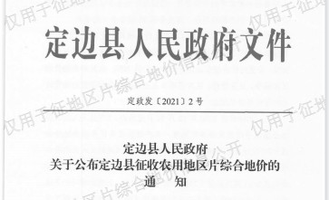 陕西省定边县2022年最新征收农用地区片综合地价(征地拆迁补偿标准)已于2021年调整完毕公布实施陕西省定边县征收农用地区片综合地价(征地拆迁补偿标准):定边街道办事处:县城、西园子村、北园子村西南部(青银高速西南侧)、南园子村北部(太中银铁路北侧)、东园子村、李园子村耕地补偿标准165240元 亩;种植园用地补偿标准156980元 亩;林地