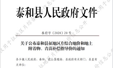 江西省关泰和县2022年最新征地区片综合地价(征地拆迁补偿标准)、地上附着物、青苗补偿标准已于2020年调整完毕公布实施江西省关泰和县征地区片综合地价(征地拆迁补偿标准):Ⅰ区片澄江镇耕地、园地、人工高产油茶园、养 殖坑塘、农村集体建设用地征地拆迁补偿标准41000元 亩;林地、其它农用地征地拆迁补偿标准16400元 亩;未利用地征地拆迁补偿标准12300元 亩;