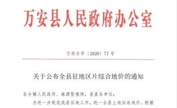 江西省万安县2022年最新征地区片综合地价(征地拆迁补偿标准)已于2020年调整完毕公布实施江西省万安县征地区片综合地价(征地拆迁补偿标准):芙蓉镇(五丰村、建峰村、芙蓉村、光明村)征地拆迁补偿标准41100元 亩;芙蓉镇(龙溪村)、五丰镇(中洲村、云洲村、荷林村)、罗塘乡(奇富村、嵩阳村)征地拆迁补偿标准38900元 亩;芙蓉镇