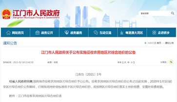 广东省江门市及下辖县市2022年最新征收农用地区片综合地价(征地拆迁补偿标准)已于2021年调整完毕公布实施广东省江门市及下辖县市征收农用地区片综合地价(征地拆迁补偿标准):蓬江区土地补偿费4 545万元 亩,安置补助费4 545万元 亩;江海区土地补偿费3 92万元 亩,安置补助费3 93万元 亩;新会区土地补偿费3 98万元 亩,安置补助费3 98万元
